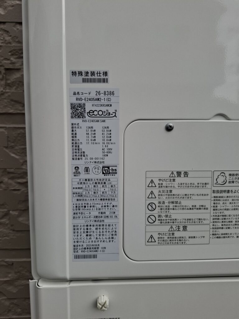 Rinnai特殊塗装仕様の給湯器に交換しました。この給湯器は耐塩害仕様で海塩による腐食やサビに強い加工が施されています。お客様のお宅も海がとても近いためこの給湯器に交換させて頂きました。