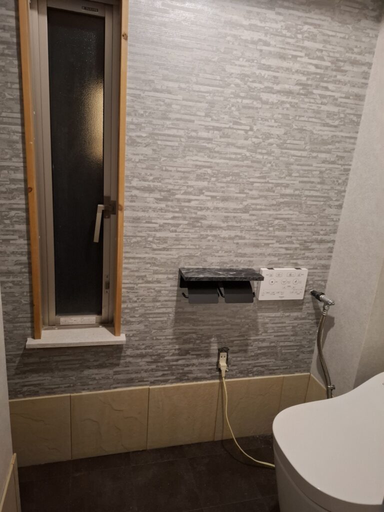 壁紙は窓側がアクセントクロスでタイルレンガ柄、床はタイル柄クッションフロアに張り替えました。トイレは手洗いタンク無しトイレでアラウーノトイレに交換しました。